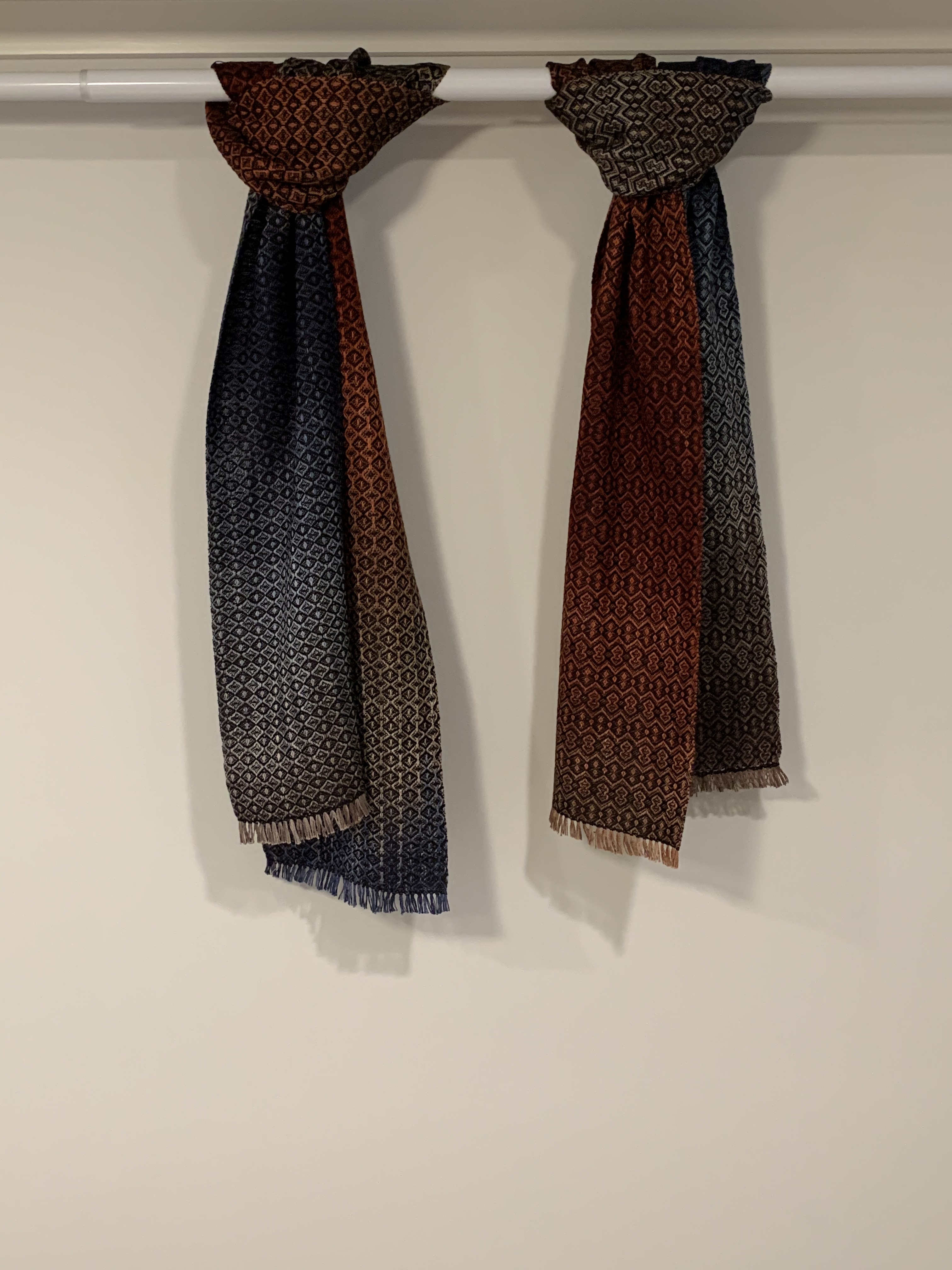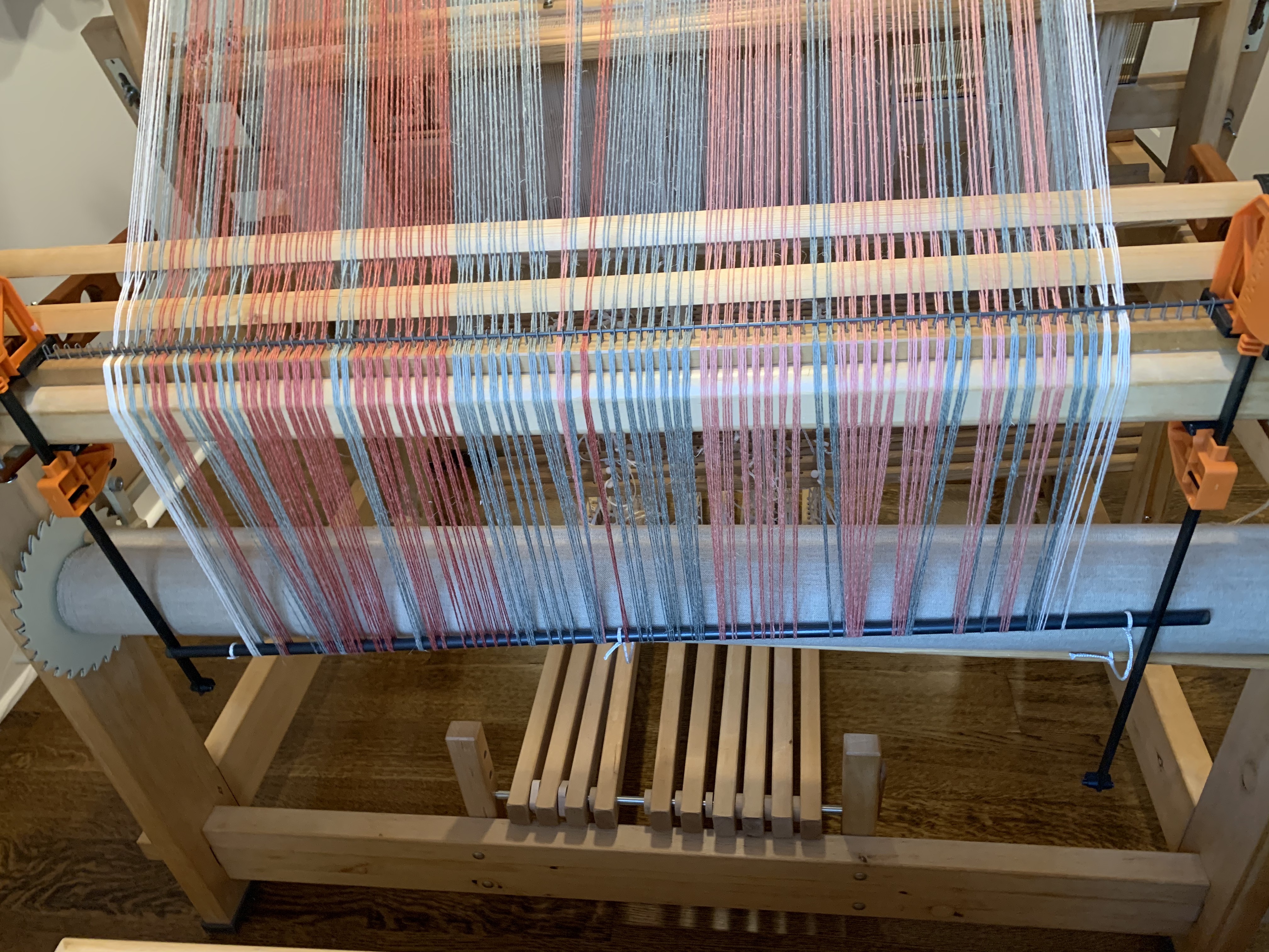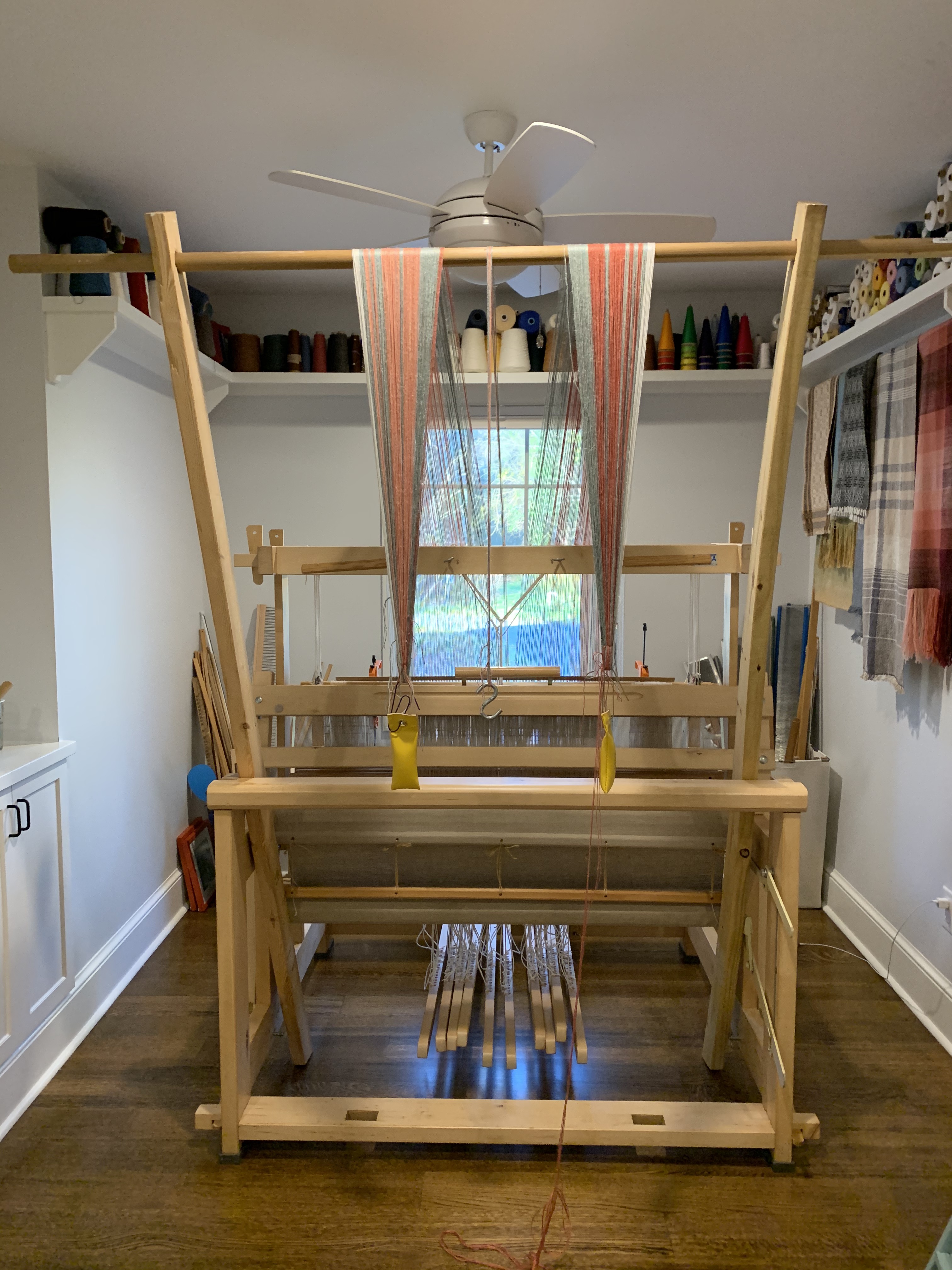 Kit from Cotton Clouds (though I’ve expanded it). Warp 8/2 cotton, Mayan Hands Dye Project. 632 ends, 120″, sett 16 DPI.